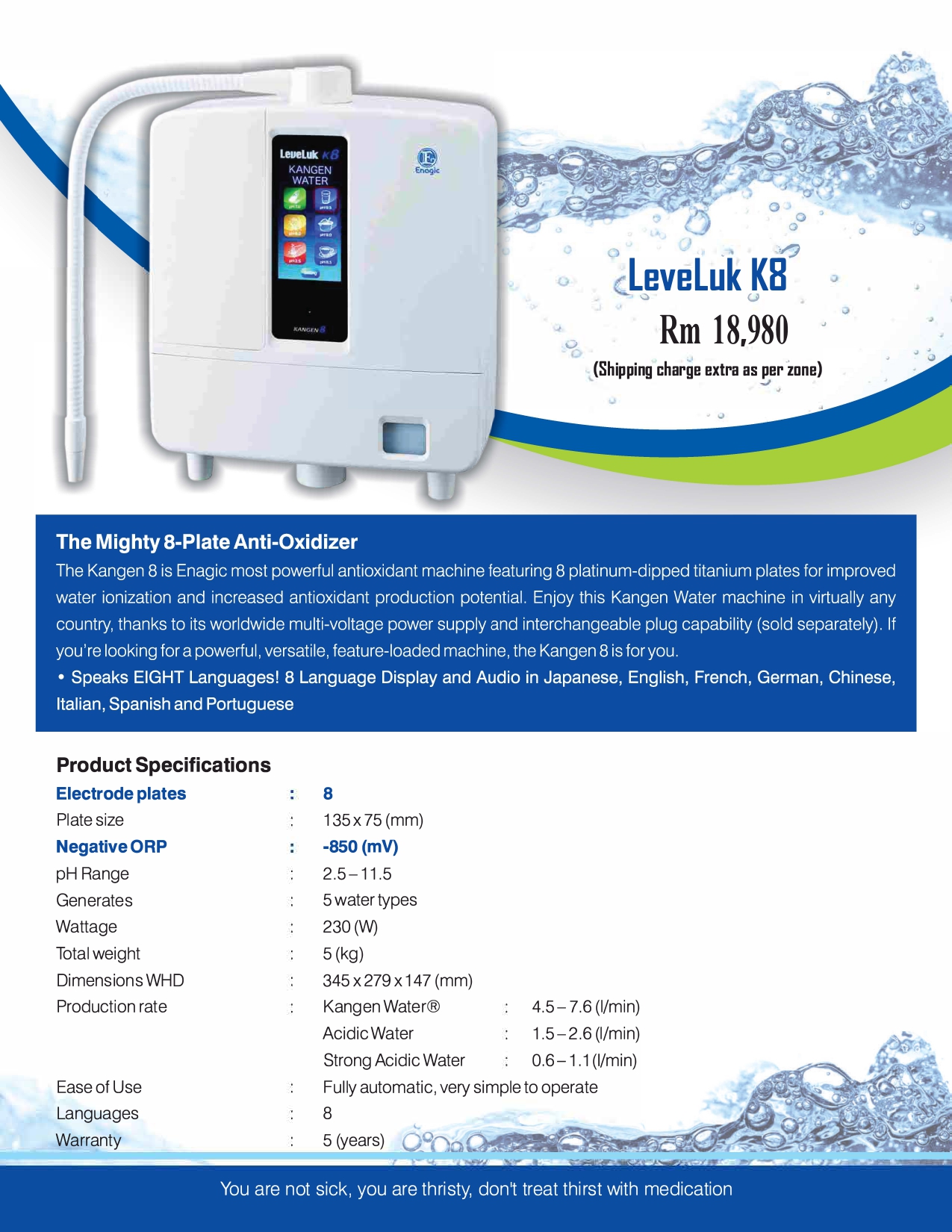 The Kangen 8 is Enagic most powerful antioxidant machine featuring 8 platinum-dipped titanium plates for improved water ionization and increased antioxidant production potential. Enjoy this Kangen Water machine in virtually any country, thanks to its worldwide multi-voltage power supply and interchangeable plug capability (sold separately). If you’re looking for a powerful, versatile, feature-loaded machine, the Kangen 8 is for you.