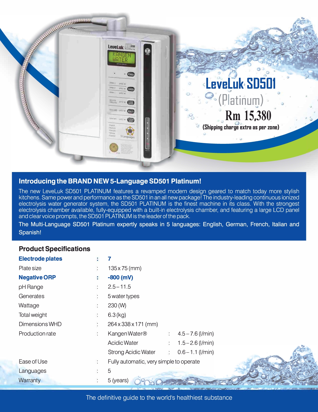The new LeveLuk SD501 PLATINUM features a revamped modern design geared to match today more stylish kitchens. Same power and performance as the SD501 in an all new package! The industry-leading continuous ionized electrolysis water generator system, the SD501 PLATINUM is the finest machine in its class. With the strongest electrolysis chamber available, fully-equipped with a built-in electrolysis chamber, and featuring a large LCD panel and clear voice prompts, the SD501 PLATINUM is the leader of the pack.