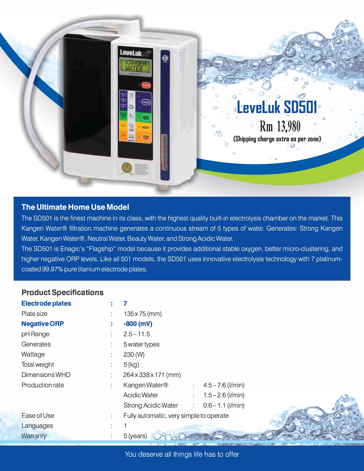 The SD501 is the finest machine in its class, with the highest quality built-in electrolysis chamber on the market. This Kangen Water® filtration machine generates a continuous stream of 5 types of water. Generates: Strong Kangen Water, Kangen Water®, Neutral Water, Beauty Water, and Strong Acidic Water.