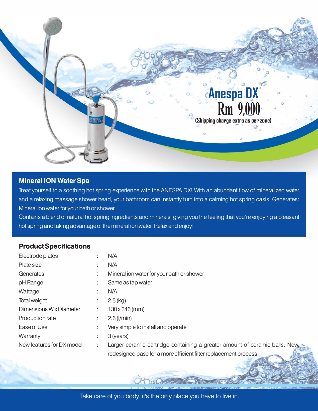 Treat yourself to a soothing hot spring experience with the ANESPA DX! With an abundant flow of mineralized water and a relaxing massage shower head, your bathroom can instantly turn into a calming hot spring oasis. Generates: Mineral ion water for your bath or shower.