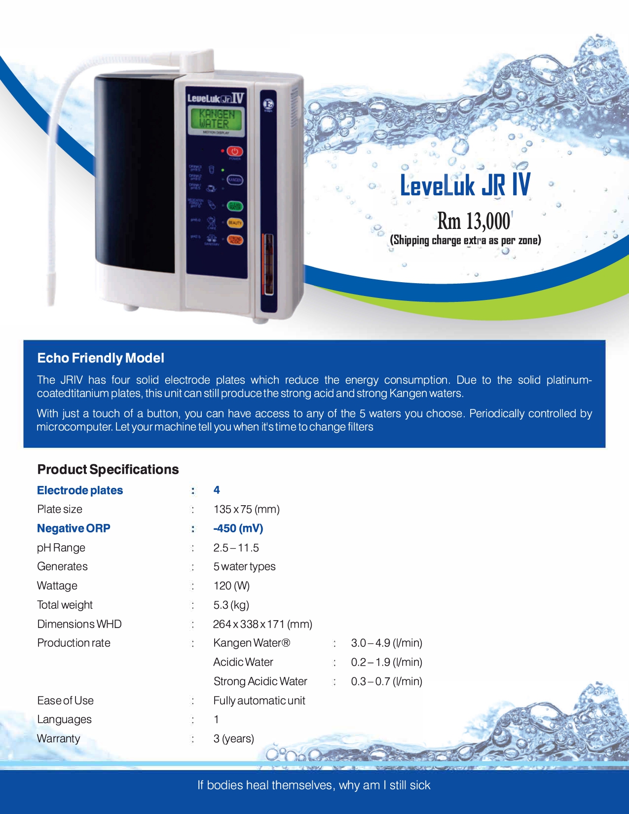 | Production rate (l/min): | Kangen Water®: 4.5 – 7.6 Acidic Water: 1.5 – 2.6 Strong Acidic water: 0.6 – 1.1 |
