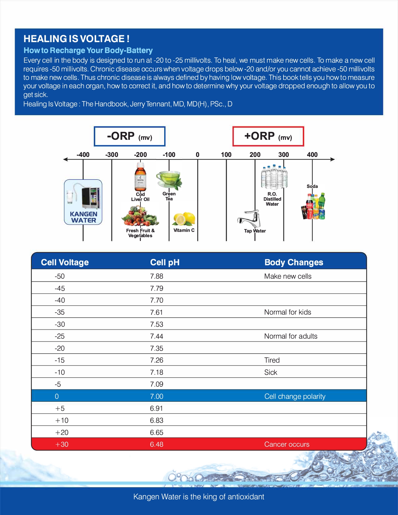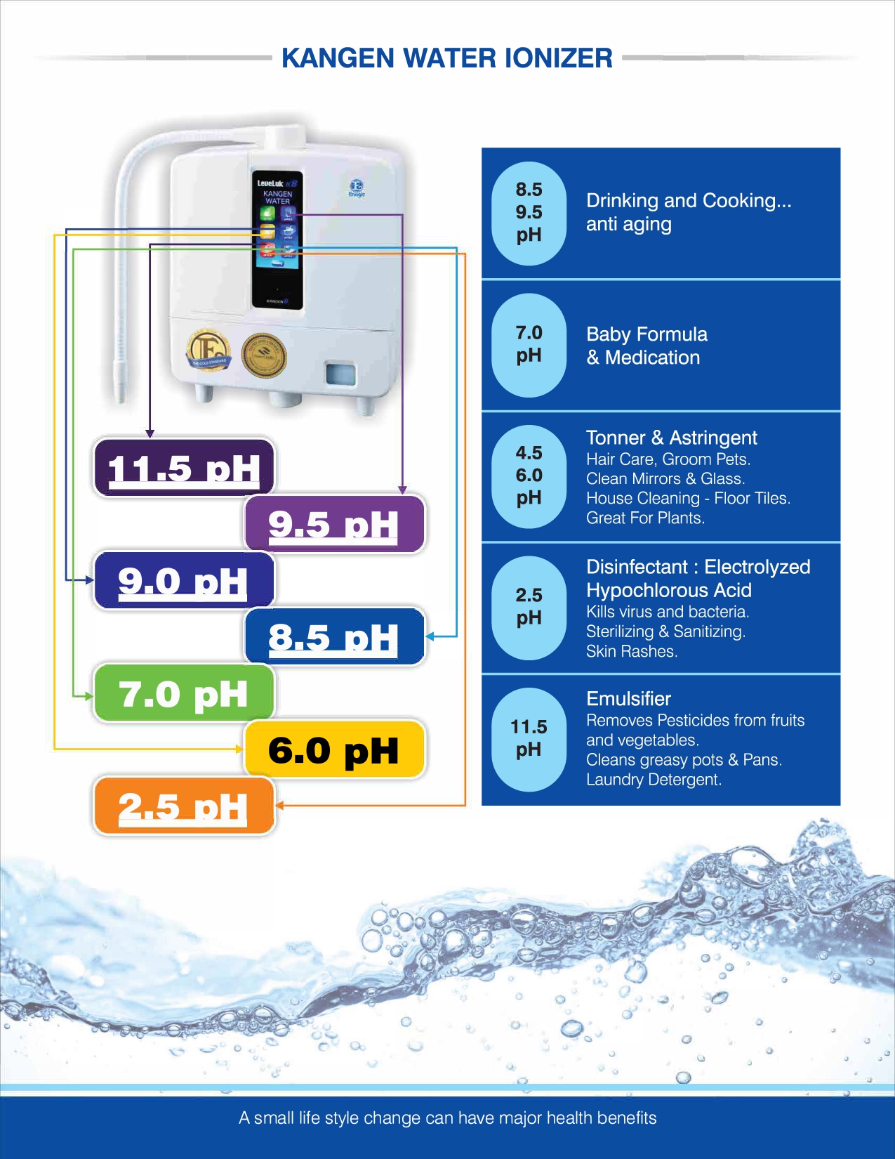 Kangen Water®: 3.0 – 4.9 Acidic Water: 0.2 – 1.9 Strong Acidic water: 0.3 – 0.7 |